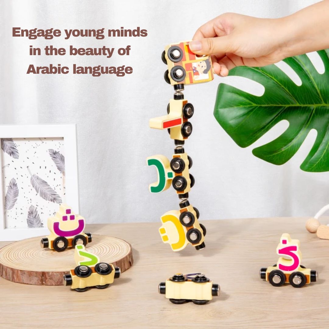 The Arabic Alphabet (Hijaiyah) Wooden Magnetic Train Set – where learning meets playtime fun!